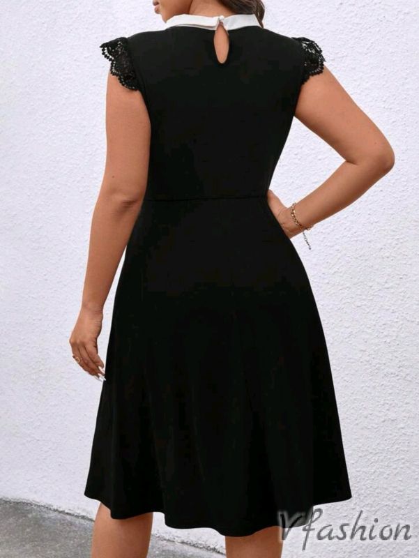 Елегантна рокля в черно с бяла яка и дантелени ръкави. Материята е еластична.