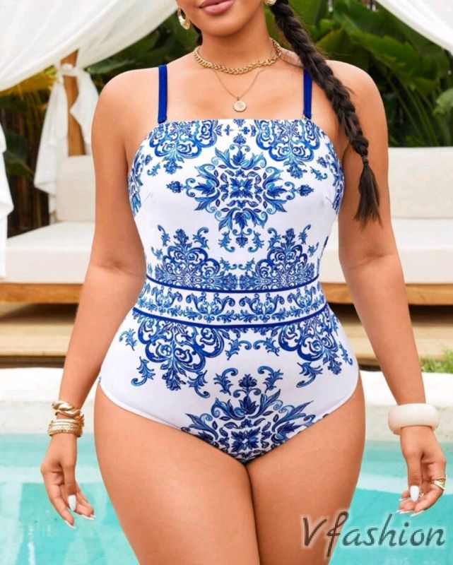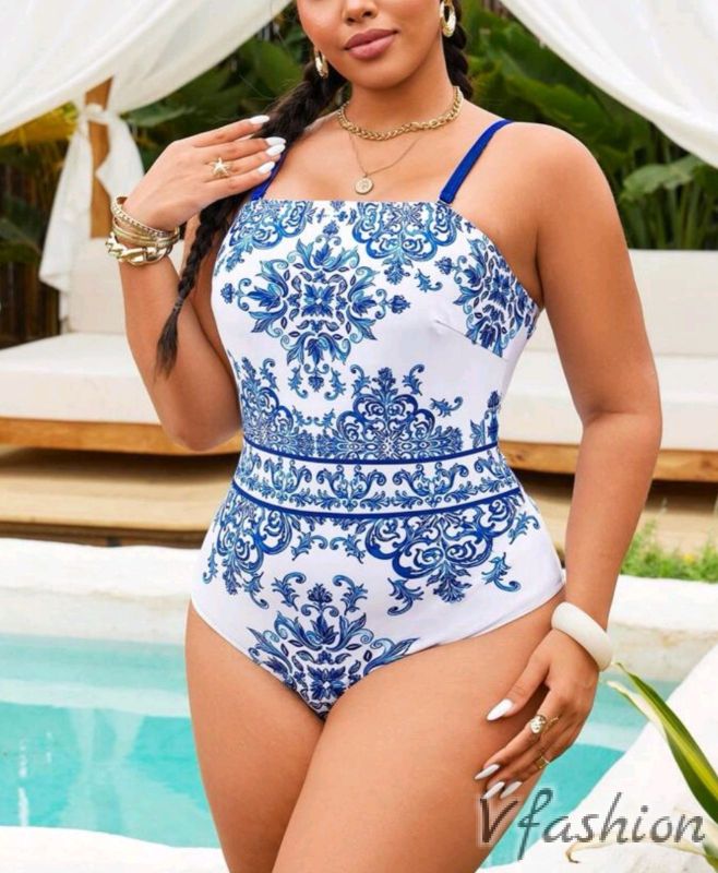 Цял бански костюм с много красив принт в синьо на бял фон. Презрамките се махат, както и подплънките. Материята е много качествена и еластична.