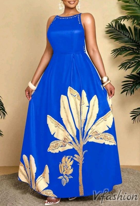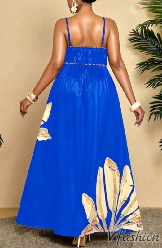Разкроена рокля с презрамки и принт палми. Роклята има ластик на гърба.