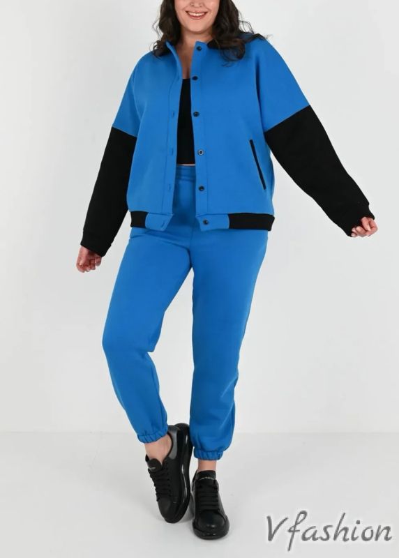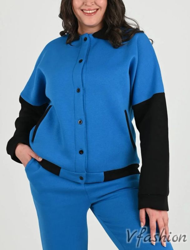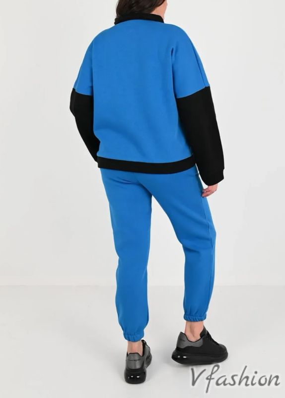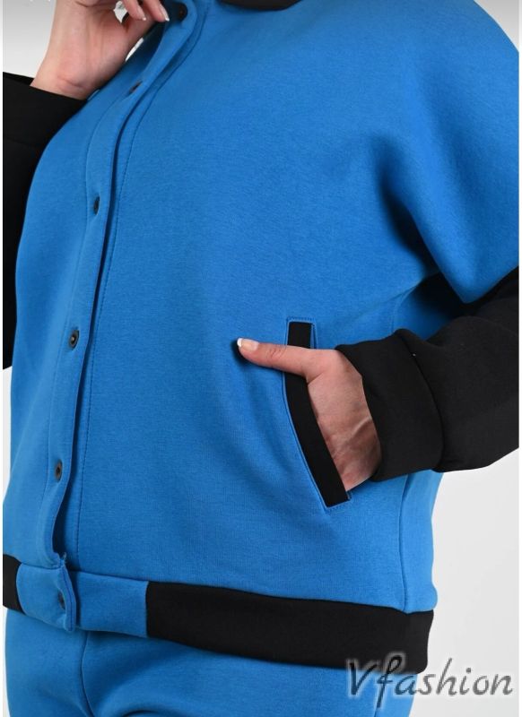 Удобен, спортен комплект от долнище и суитшърт със странични джобове. Долнището е на ластик. Комплектът е от ватиран, памучен плат.