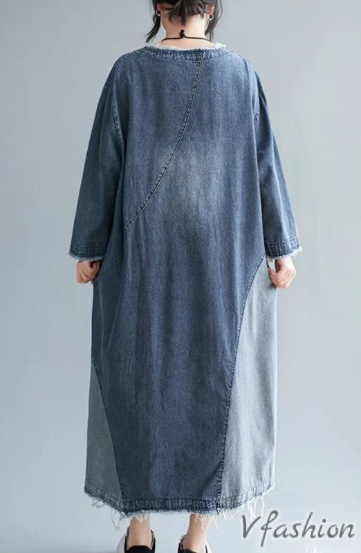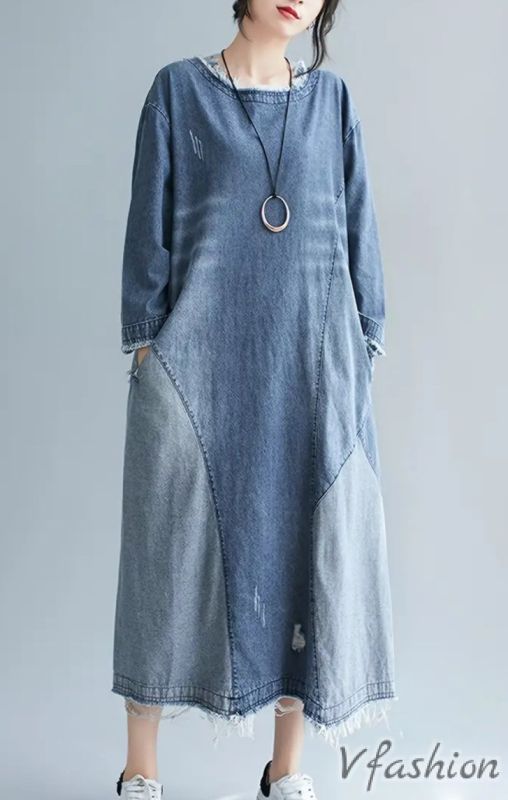 Много актуална рокля от два вида дънков плат с разбридани краища и удобни, странични джобове.