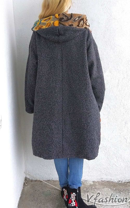 Вълнено палто с цветни акценти и качулка