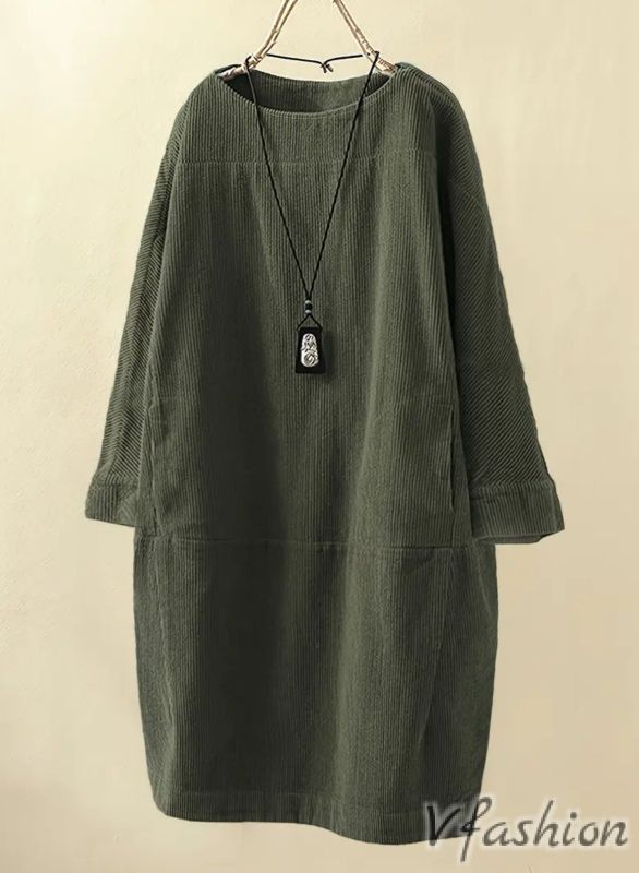 Актуална, спортно-елегантна рокля с изчистена кройка и странични джобове. Материята е не много плътно ситно кадифе.