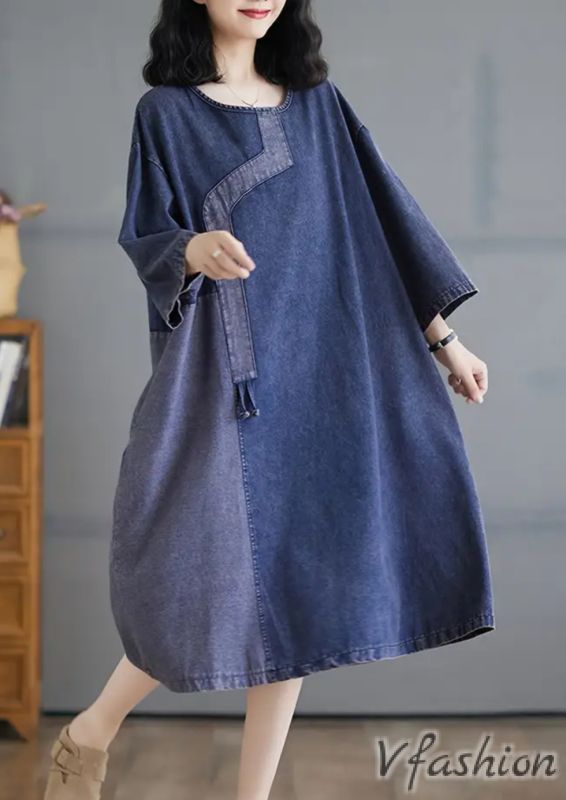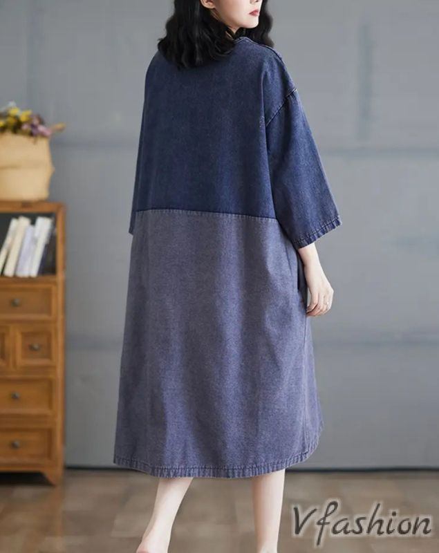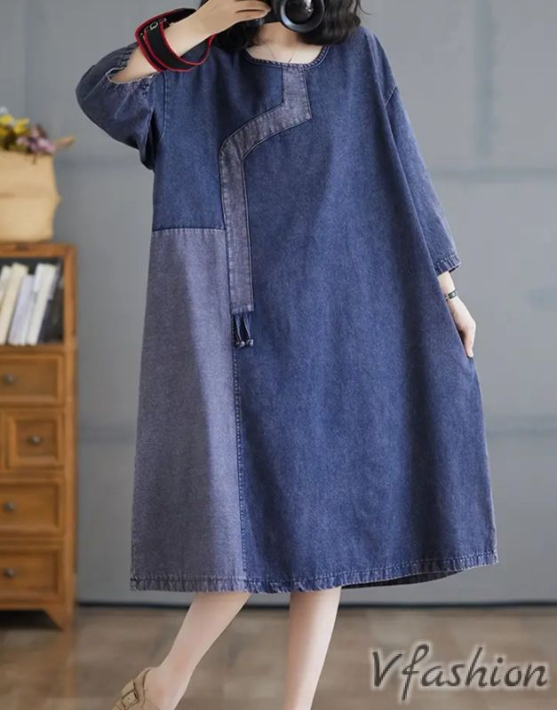 Дънкова рокля с арт акценти от дъков плат в по-светъл цвят.
