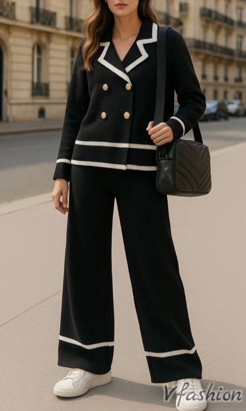 Висококачествен комплект от панталон и сако от фино плетиво в черно и бяло. Панталонът е на ластик.