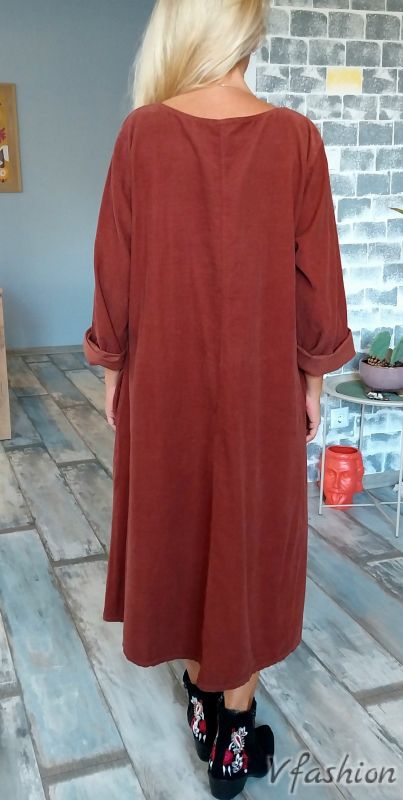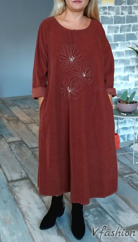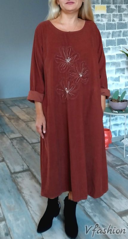 Много актуална рокля е от качествено ситно кадифе с апликации цветя. Роклята има странични джобове.