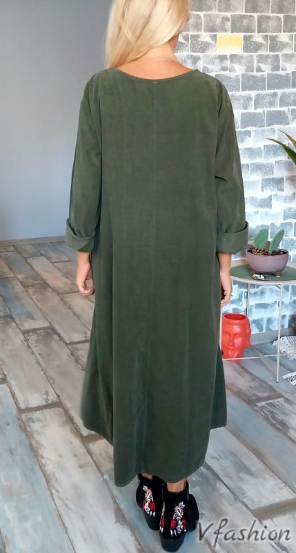 Много актуална рокля от качествено ситно кадифе с апликация цветя. Роклята има странични джобове.