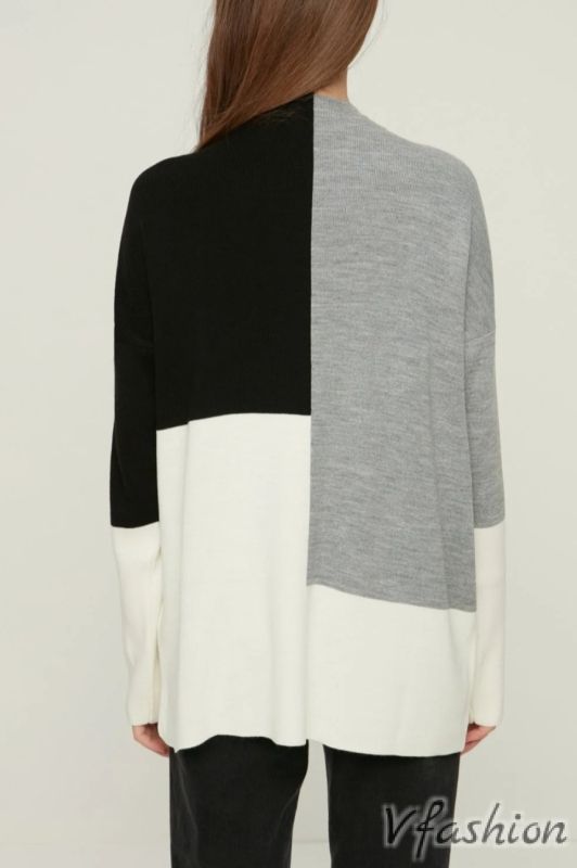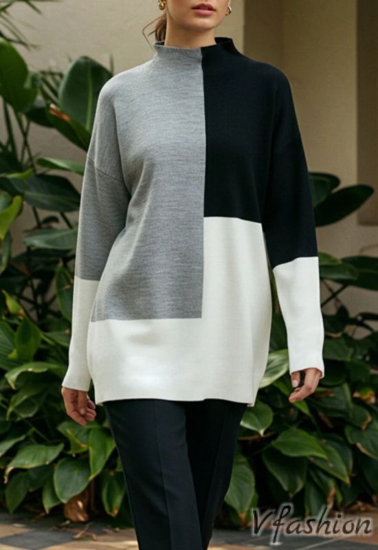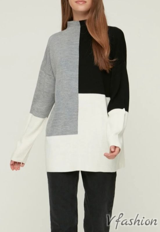 Актуален пуловер от качествено плетиво в сиво, черно и бяло.
