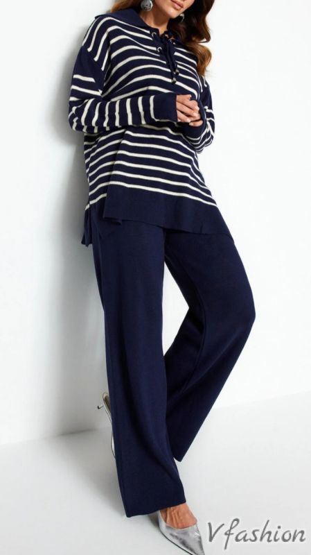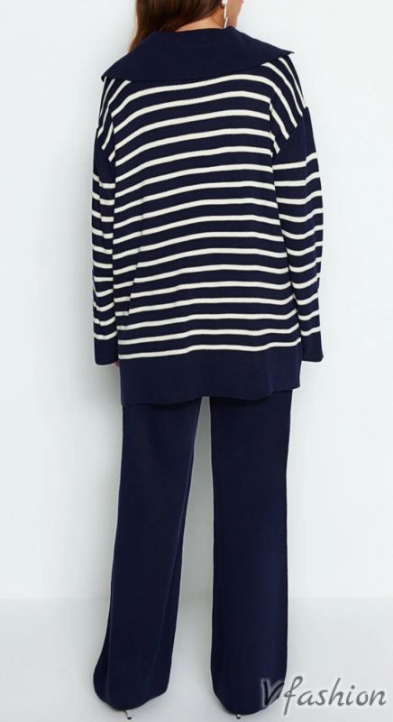 Висококачествен комплект от панталон и пуловер от фино плетиво в синьо и бяло. Панталонът е на ластик.