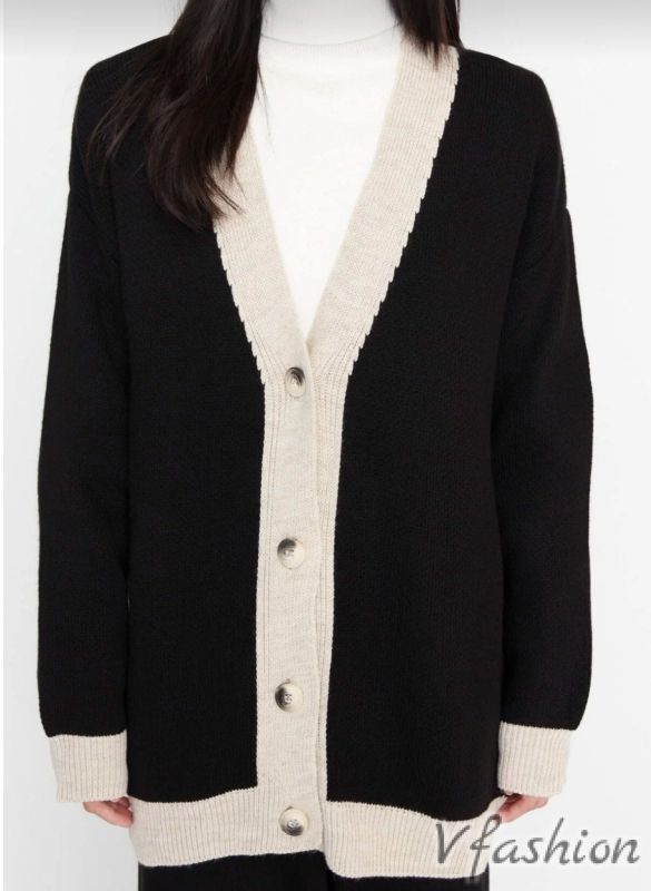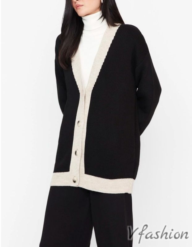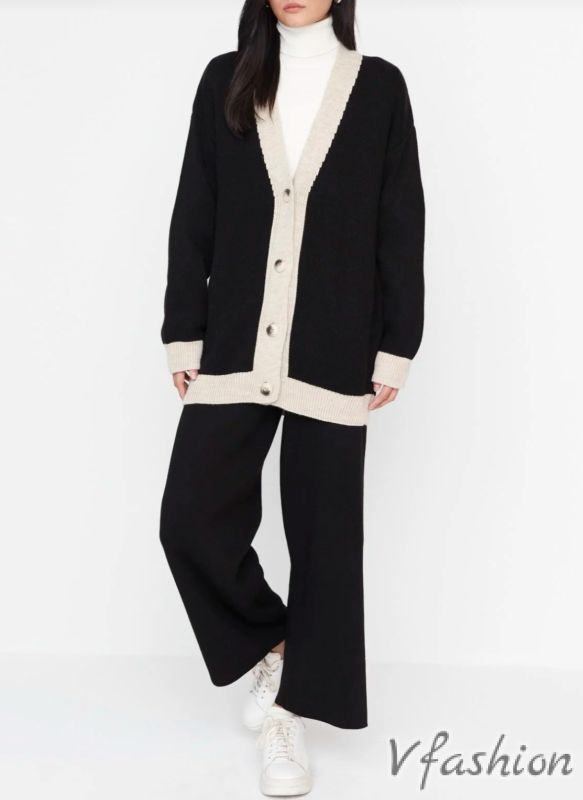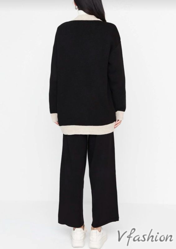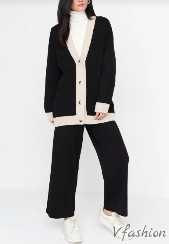 Висококачествен комплект от панталон и жилетка от плетиво в черно и бяло. Панталонът е на ластик.