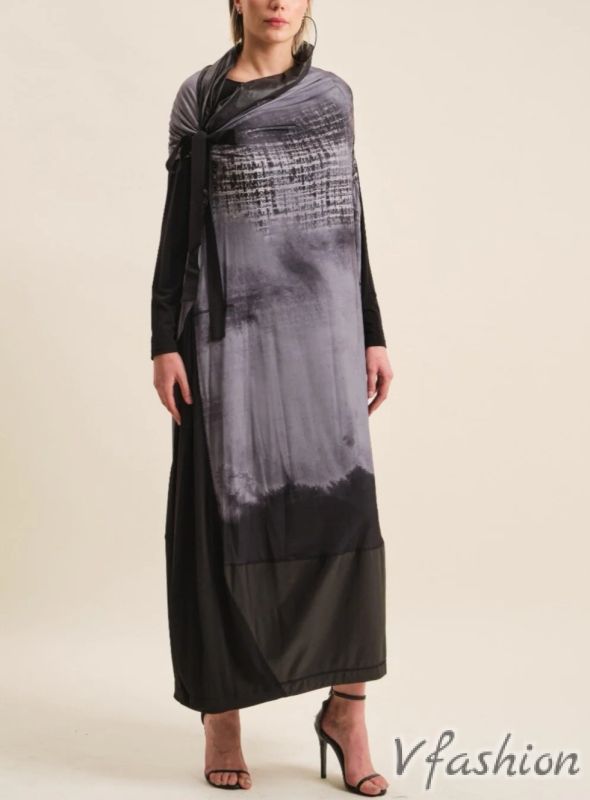 Много красива и изключително качествена рокля от две части. Материята е качествена и еластична. Долната част е с дълъг ръкав, а горната е по-широка и без ръкав.