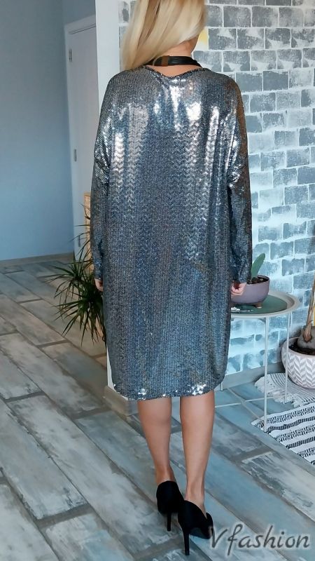 Елегантна, парти рокля със сребристи акценти. Роклята е от много приятна, леко еластична материя.