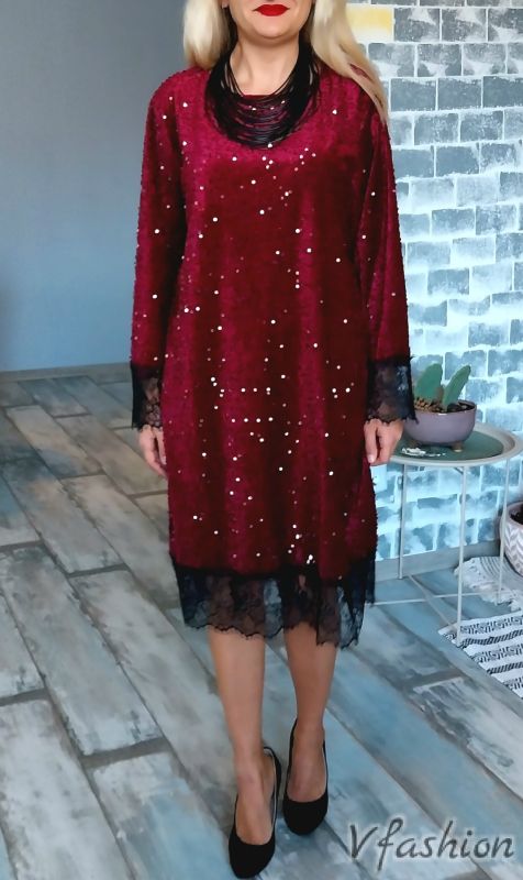 Стилна, официална рокля от фино кадифе с пайети и дантела.