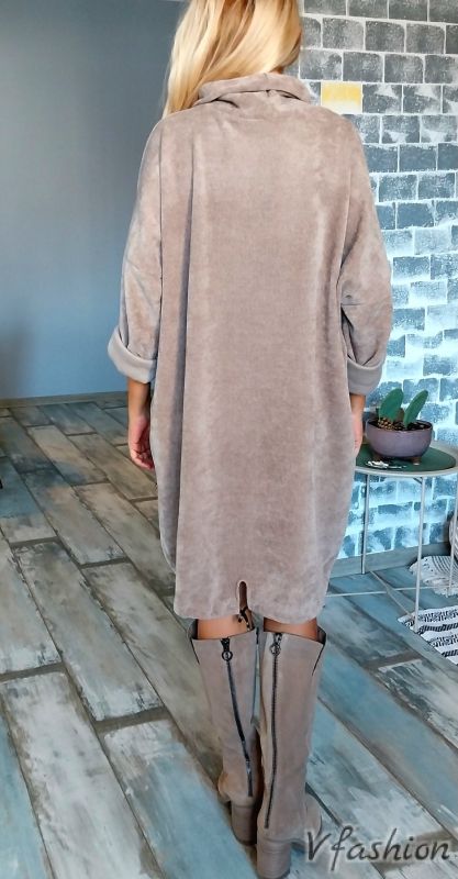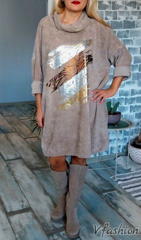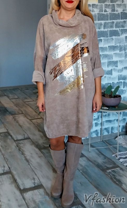 Мека и удобна рокля/туника с принт в златисто и сребристо на бежов фон.