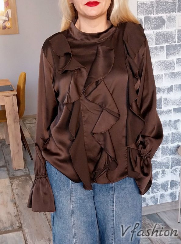 Сатенена блуза с волани - кафява