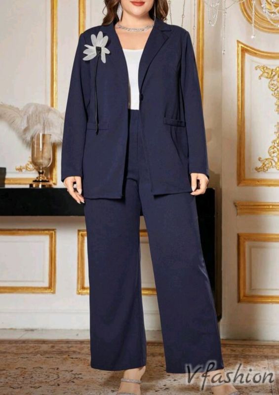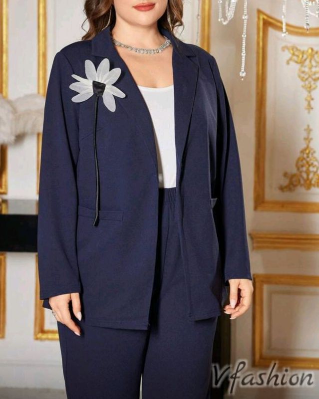 Стилен, спортно-елегантен комплект от панталон и сако с акцент цвете. Панталонът е на ластик.