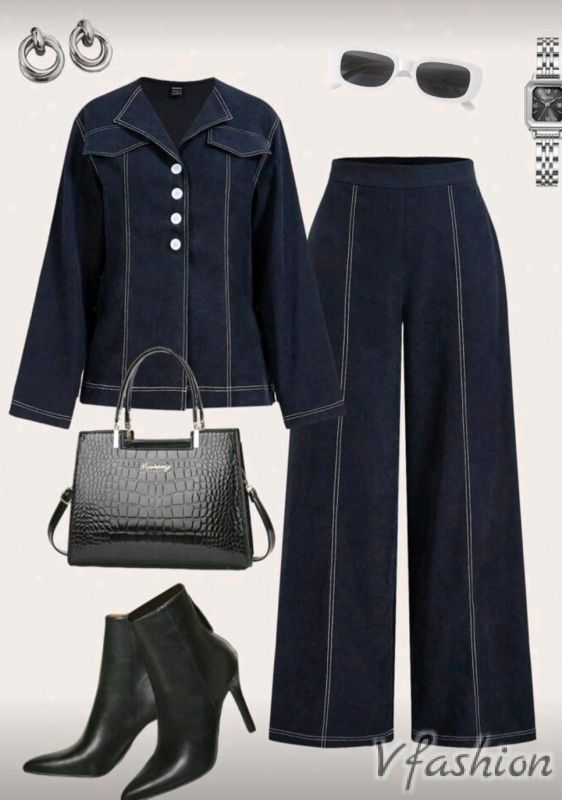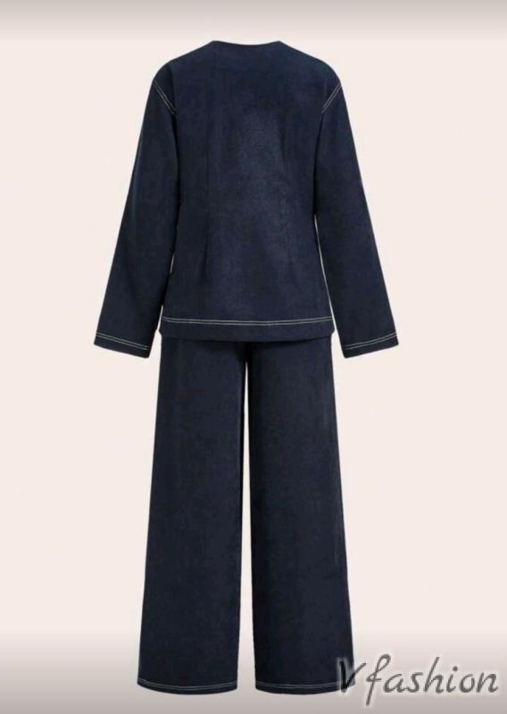 Спортно-елегантен комплект от панталон и сако от син плат. Панталонът е на ластик на кръста.