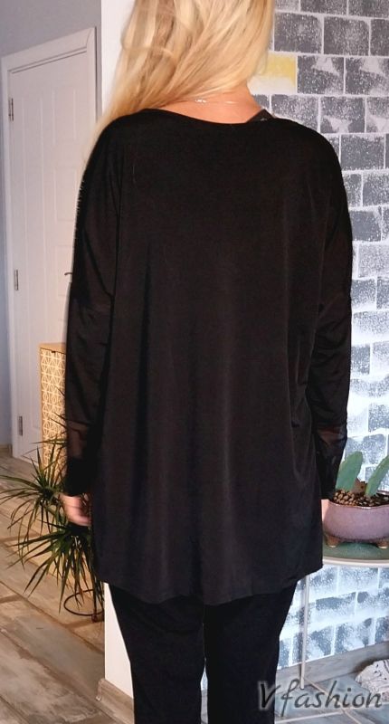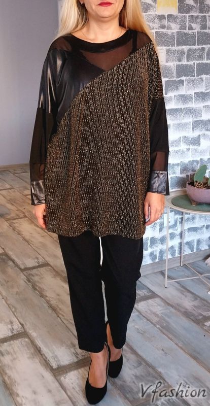 Елегантна блуза/туника с много актуални мотиви от тюл, еко кожа и златисти нишки. Материята е еластична.