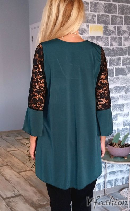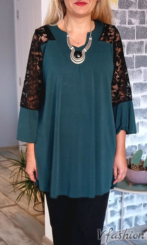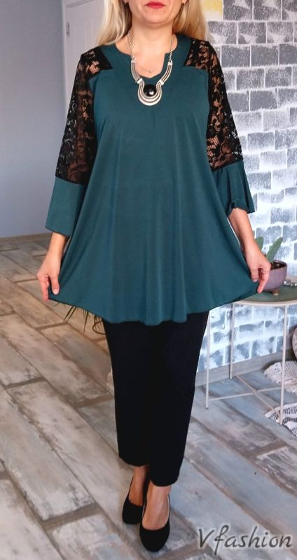 Елегантна, разкроена туника с дантела. Материята е еластична.