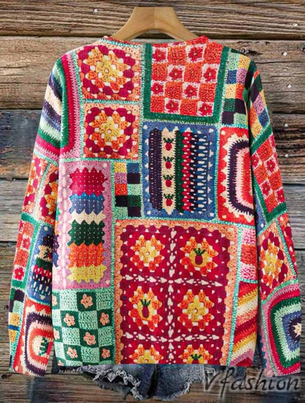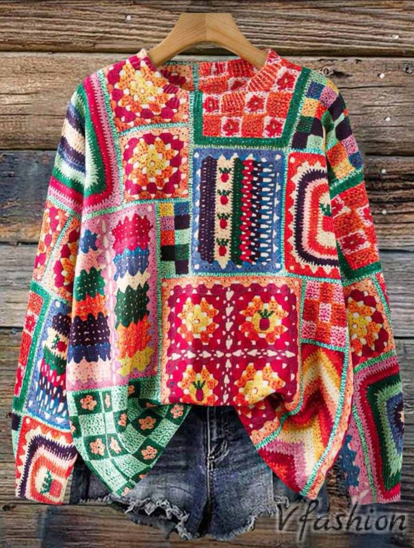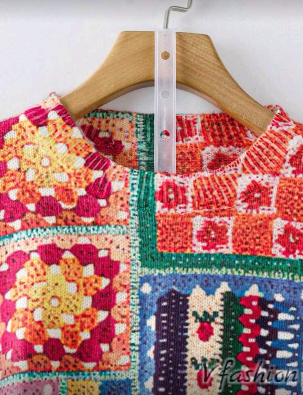 Пуловер от меко плетиво с цветен, пачуърк принт.