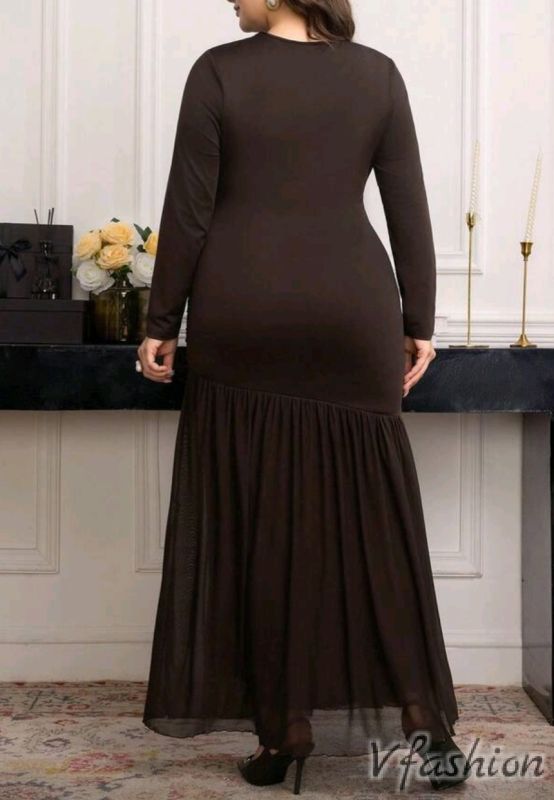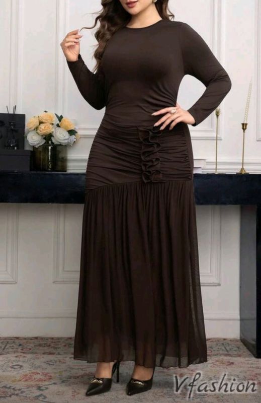 Много елегантна рокля в кафяво с тюл и мотиви от същия плат. Материята е еластична.