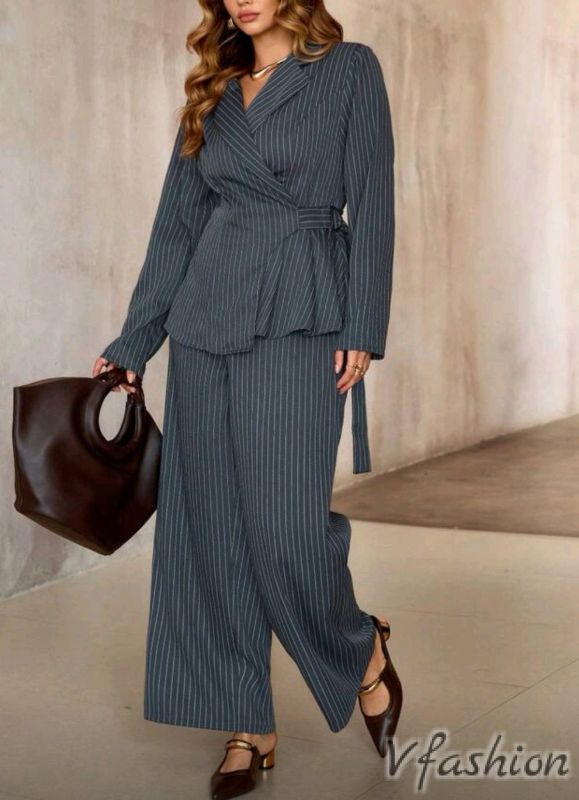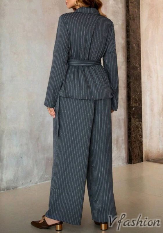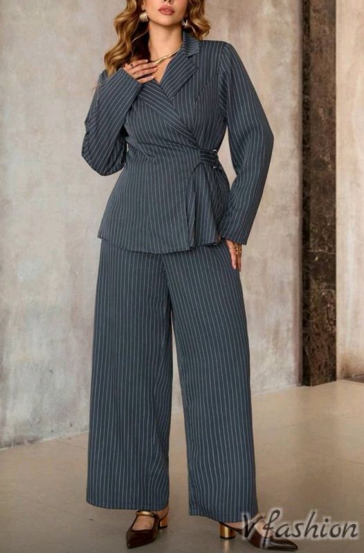Много стилен и модерен костюм от панталон и сако, което се затяга отстрани с колан.