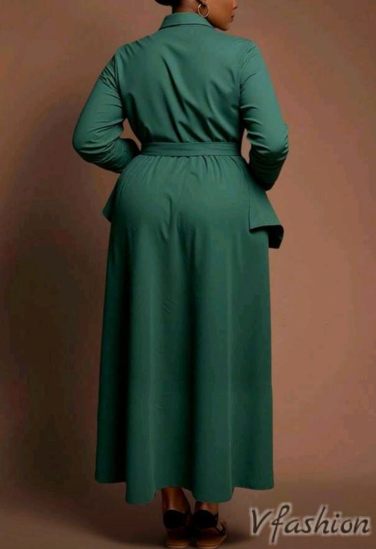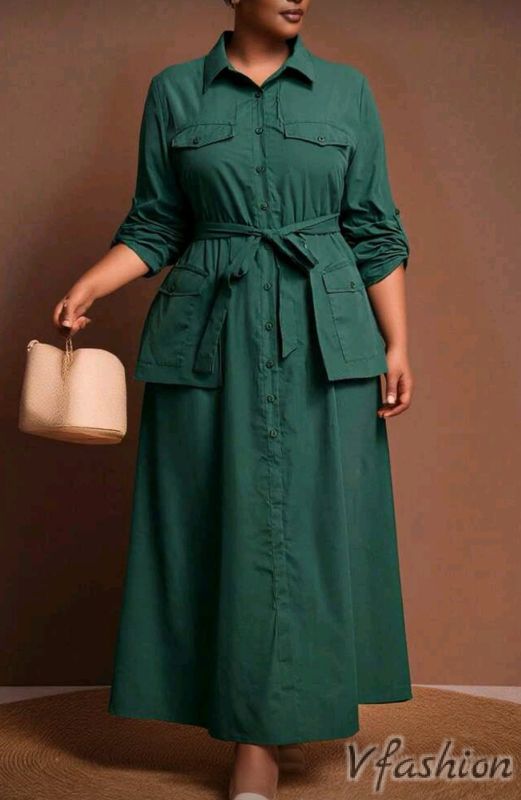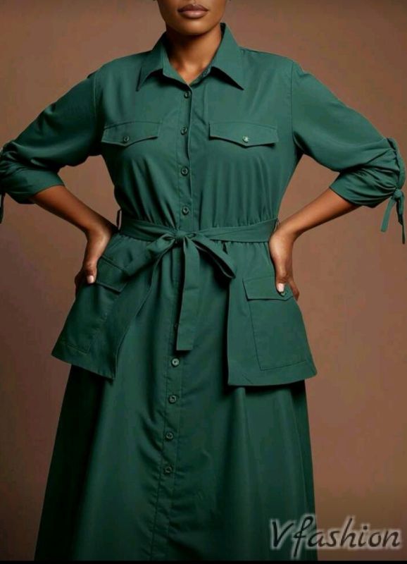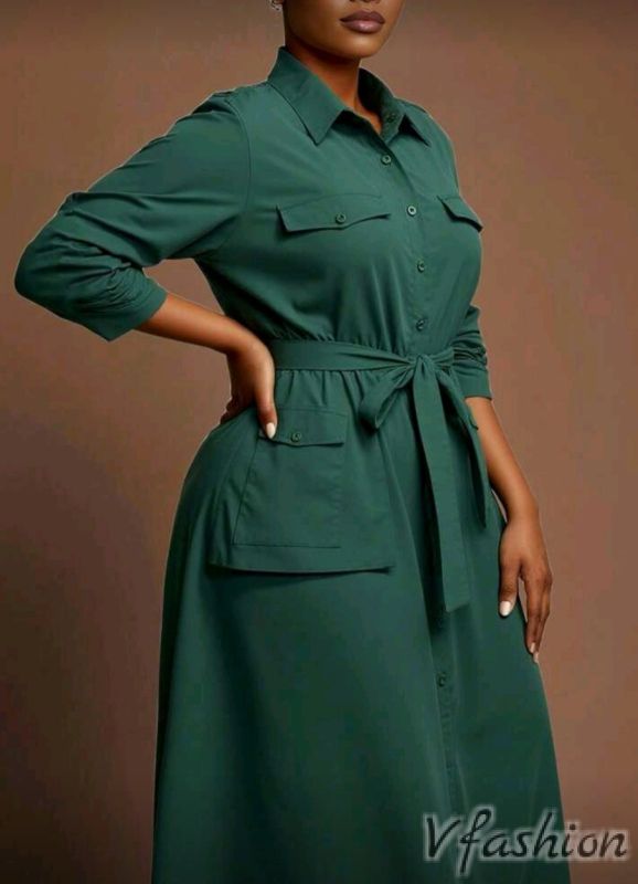 Спортно-елегантна рокля-риза с интересни джобове. Роклята има колан от същия плат.