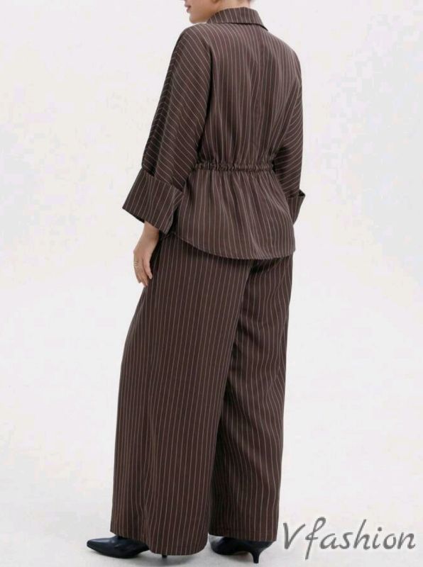 Спортно-елегантен комплект от панталон и риза с връзка на тънки райета.