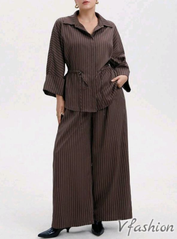 Комплект панталон и риза с връзка - кафяв