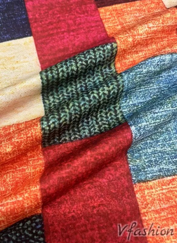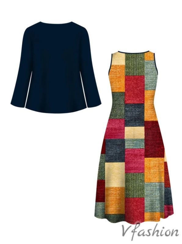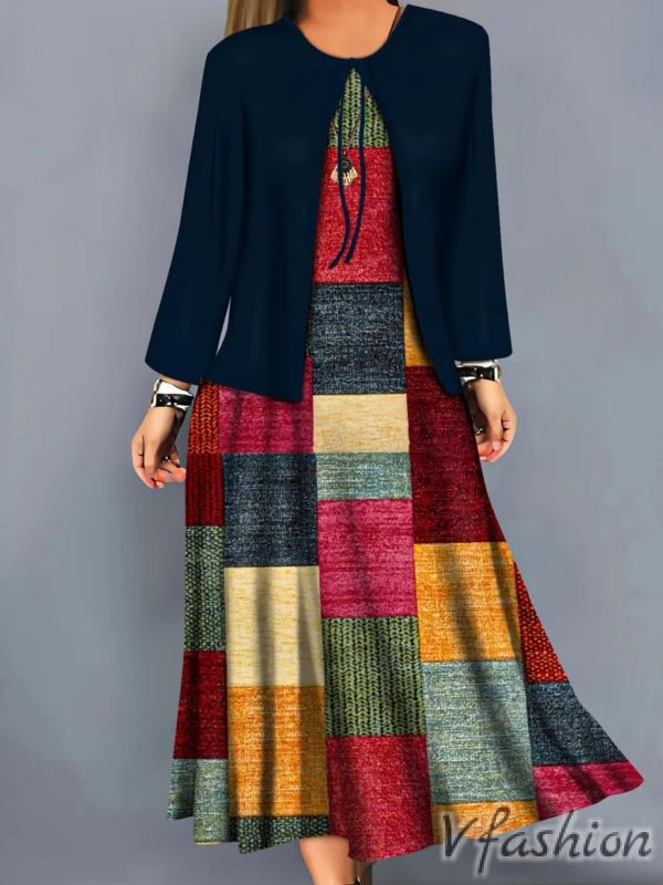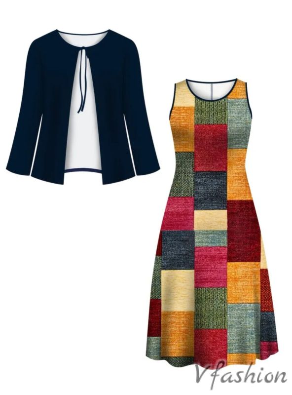 Стилен комплект от рокля с принт и сако тип тънка наметка. И двете са от еластична материя.