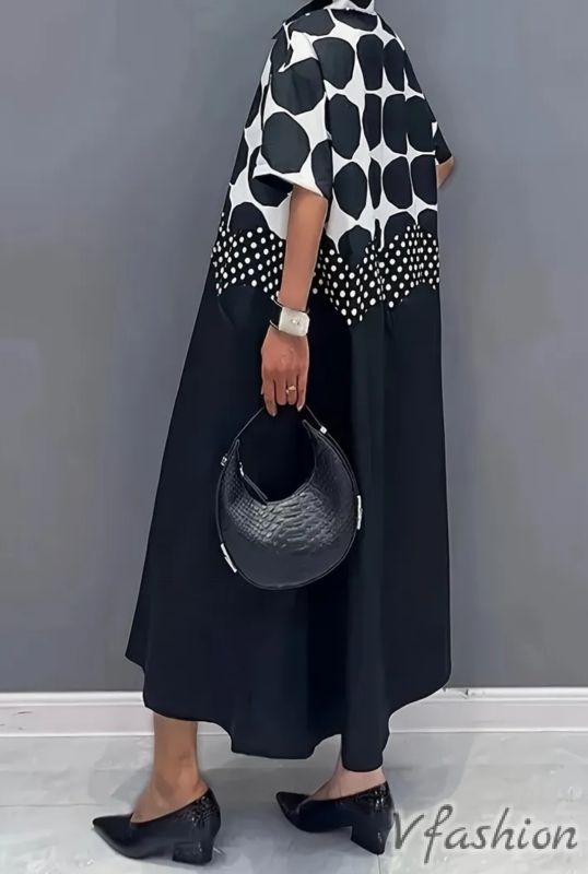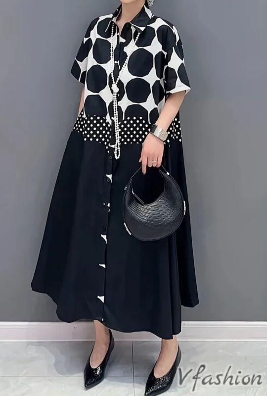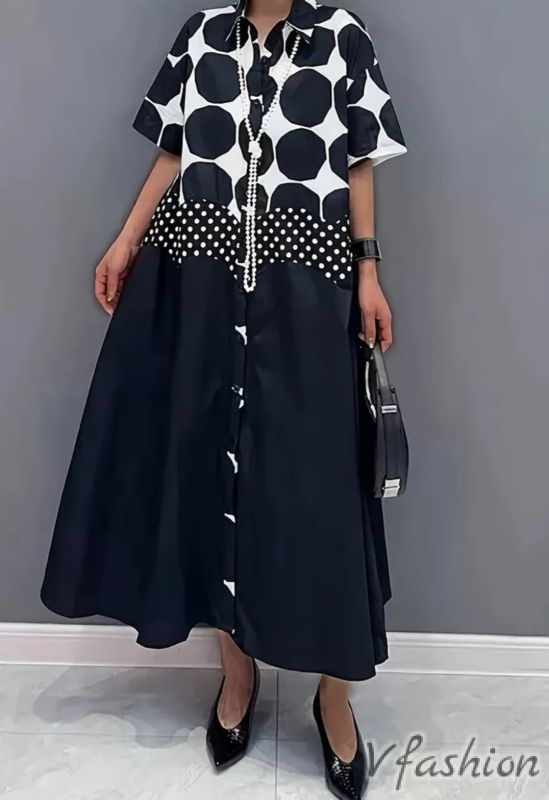 Спортно-елегантна рокля с копчета и принт малки и големи точки.